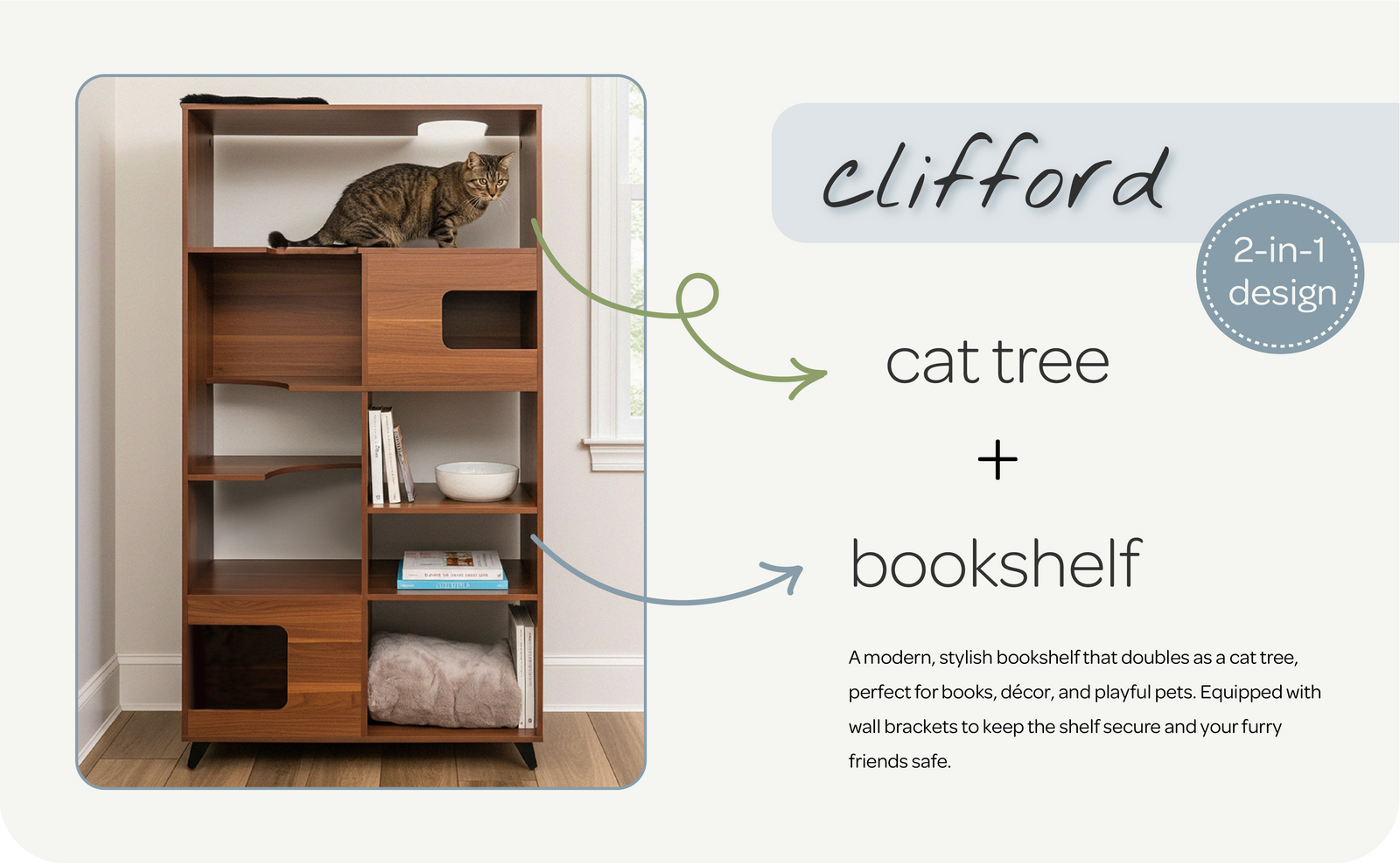 Designed for style enthusiasts and pet lovers alike, the Clifford Cat Tree Bookshelf brings refined structure, secure wall-mounted stability, and multifunctional storage together in one elevated piece.