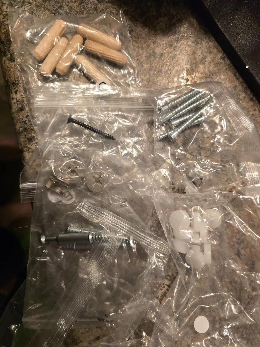 I attach a picture of all the leftover hardware I have. Six dowels, seven screws, three cams, three pin bits (that go into the cams), and 9 what I can only assume were meant to be feet but I couldn't figure out how to attach them as there weren't any holes to insert them into and they don't just press in... despite all this leftover hardware it feels very well put together and doesn't feel on the verge of falling apart. Very scratchy on my floor but having feet would help, if only I could figure out how to insert them. Speaking of, I'm going to do what I should've done already and message customer service to ask for their advice as I'm sure they'll respond and be helpful.